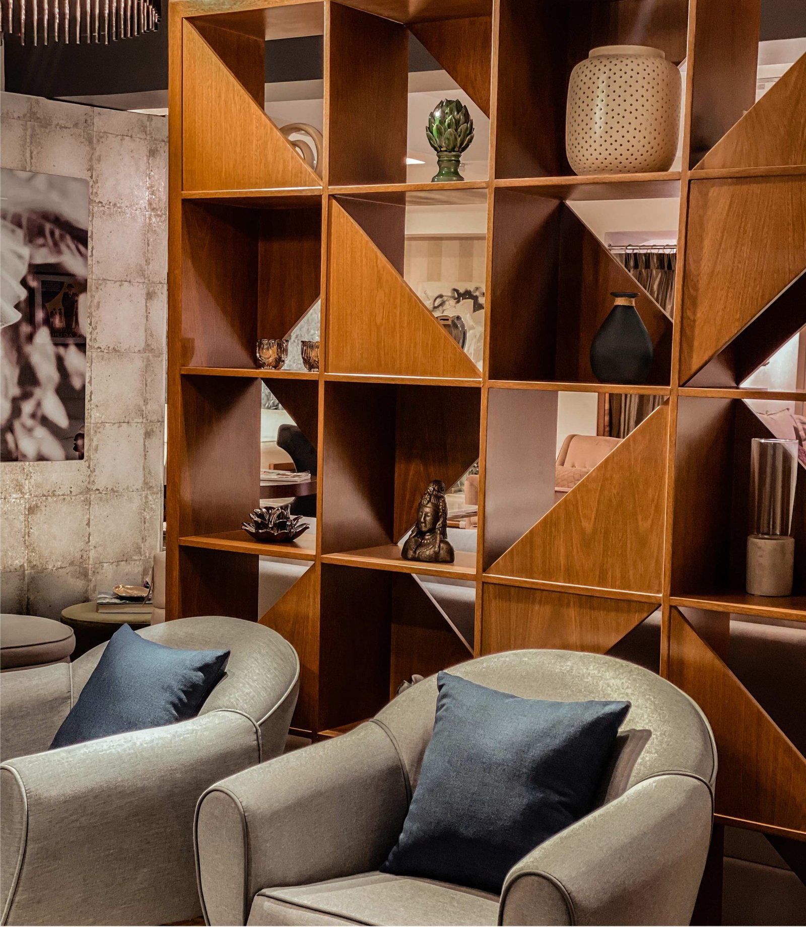 Estante separador de ambientes hecho de madera de roble.